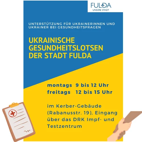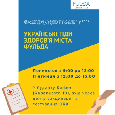 ФУЛЬДА, 15. Juni 2022: Місто Фульда створило нову пропозицію для українців: проект «Українські медичні довідники міста Фульда» спрямований на підтримку українців, які нещодавно приїхали до Фульди та потребують допомоги у вирішенні проблем зі здоров’ям.