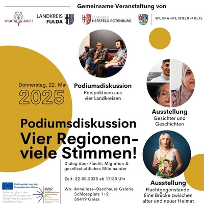 Unter dem Titel „Vier Regionen, Viele Stimmen“ berichten Menschen mit Migrationsgeschichte aus den vier beteiligten Landkreisen über ihre persönlichen Erfahrungen. Im Rahmen der Veranstaltung werden zudem zwei Ausstellungen gezeigt: